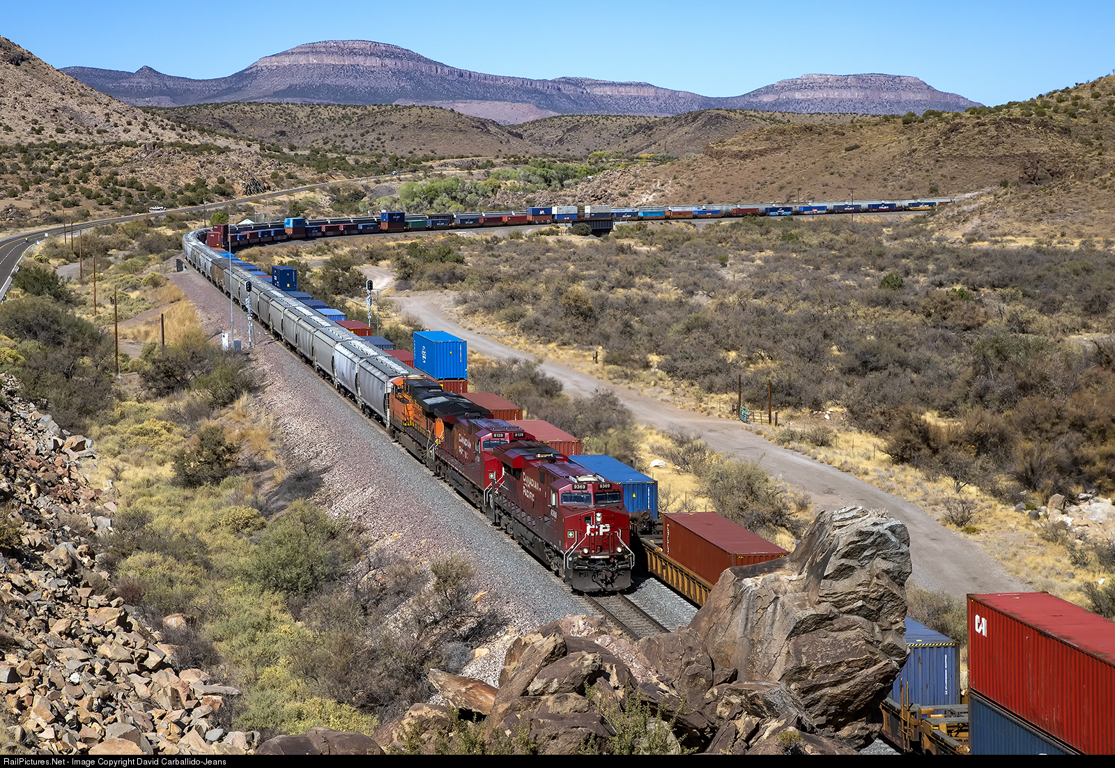 | A pair of Canadian Pacific motors lead a Sweet Grass (CP interchanged), MT to Fresno, CA unit grain train out of Crozier Canyon as a westbound stack train over takes it on the opposite main track. The CP train will be coming to a stop at West Valentine where a "dog catch" crew will take the train the rest of the way into Needles. |