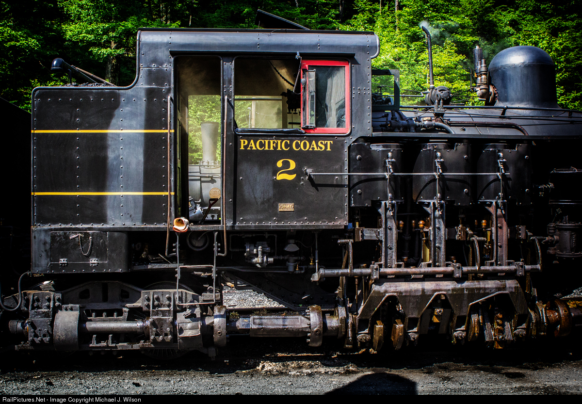 According to the Cass Scenic Railroad's website, this Shay packs 38,143 lbs of tractive effort with a whopping maximum speed of 17.8 mph. Her wheel diameter is 36" and her boiler pressure is 200 lbs. Empty, the engine weighs 98 tons with a coal capacity of 5 tons and a water capacity of 3,000 gallons.