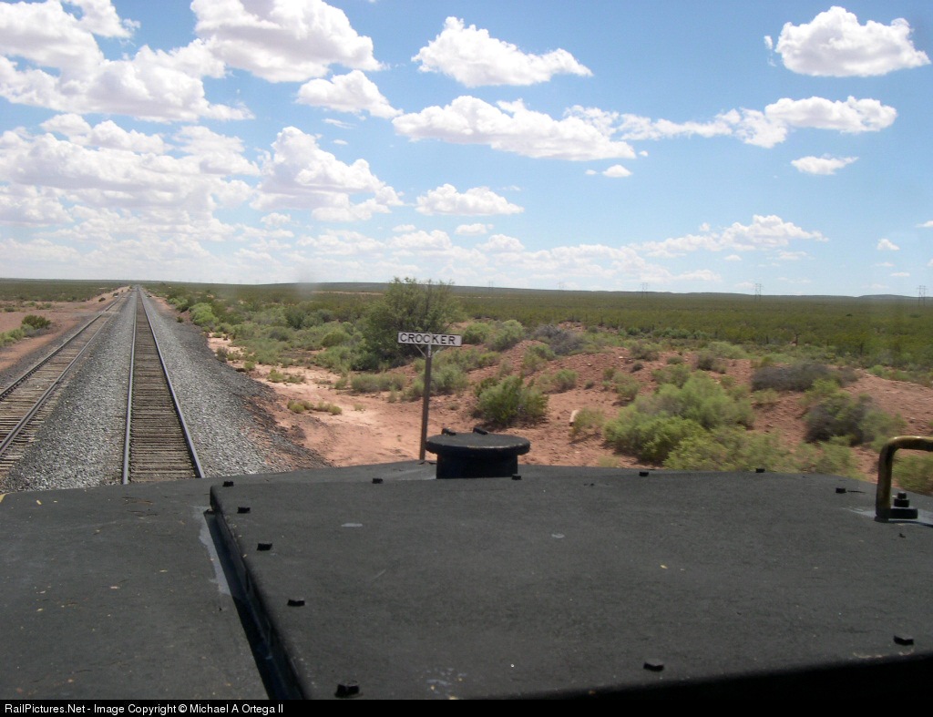 Running by station sign Crocker, the Belen to El Paso train continues through the Land of Enchantment.