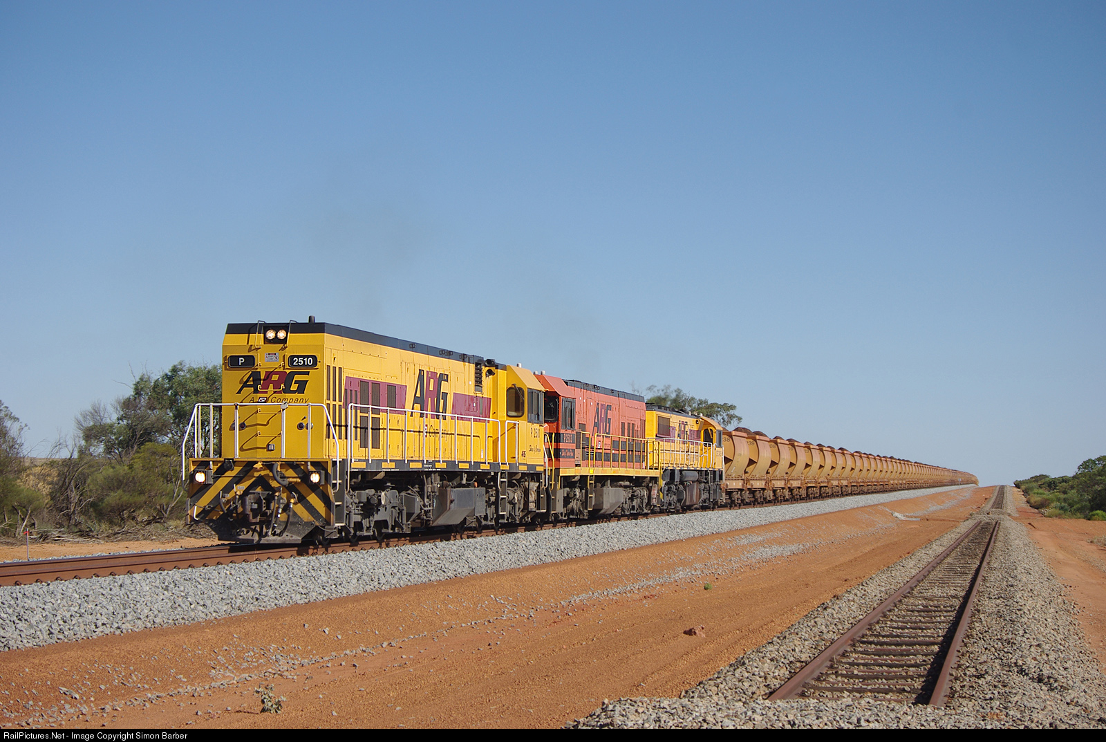 | P2510, 2503 and DFZ2405 coast downhill with a loaded iron ore train from Extension Hill. |