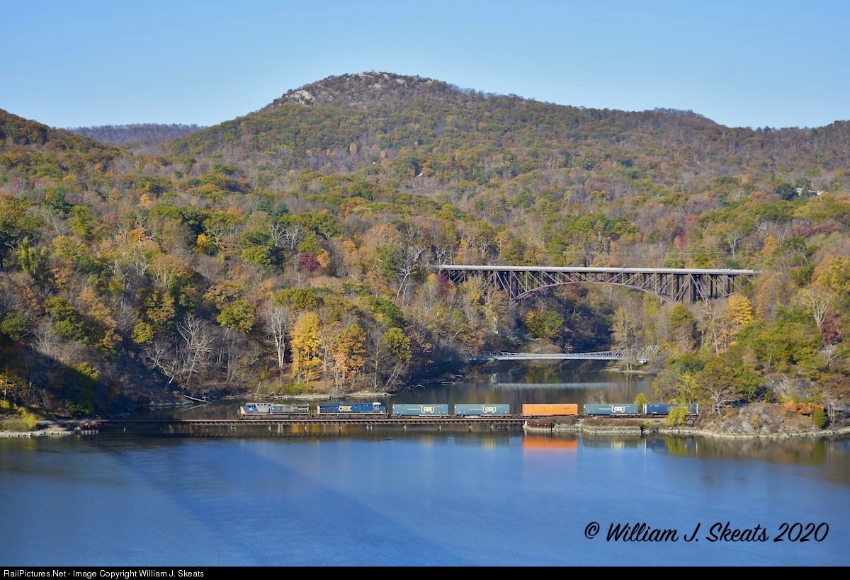 Fall colors evident over Popolopen Creek Bridge as a stack train moves south.