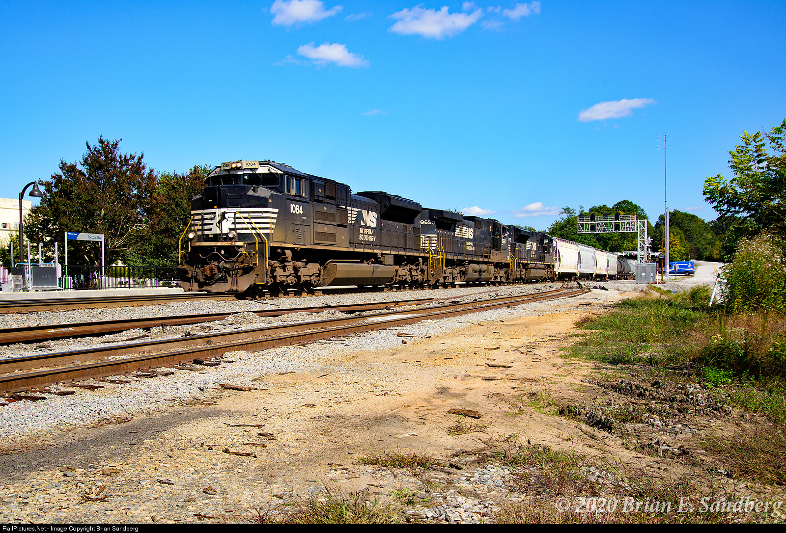| NS SD70ACe #1084 leads train 153P404 at Toccoa, GA 10/5/20. The Amtrak platform in the background sees trains 19 and 20, the Crescent. |