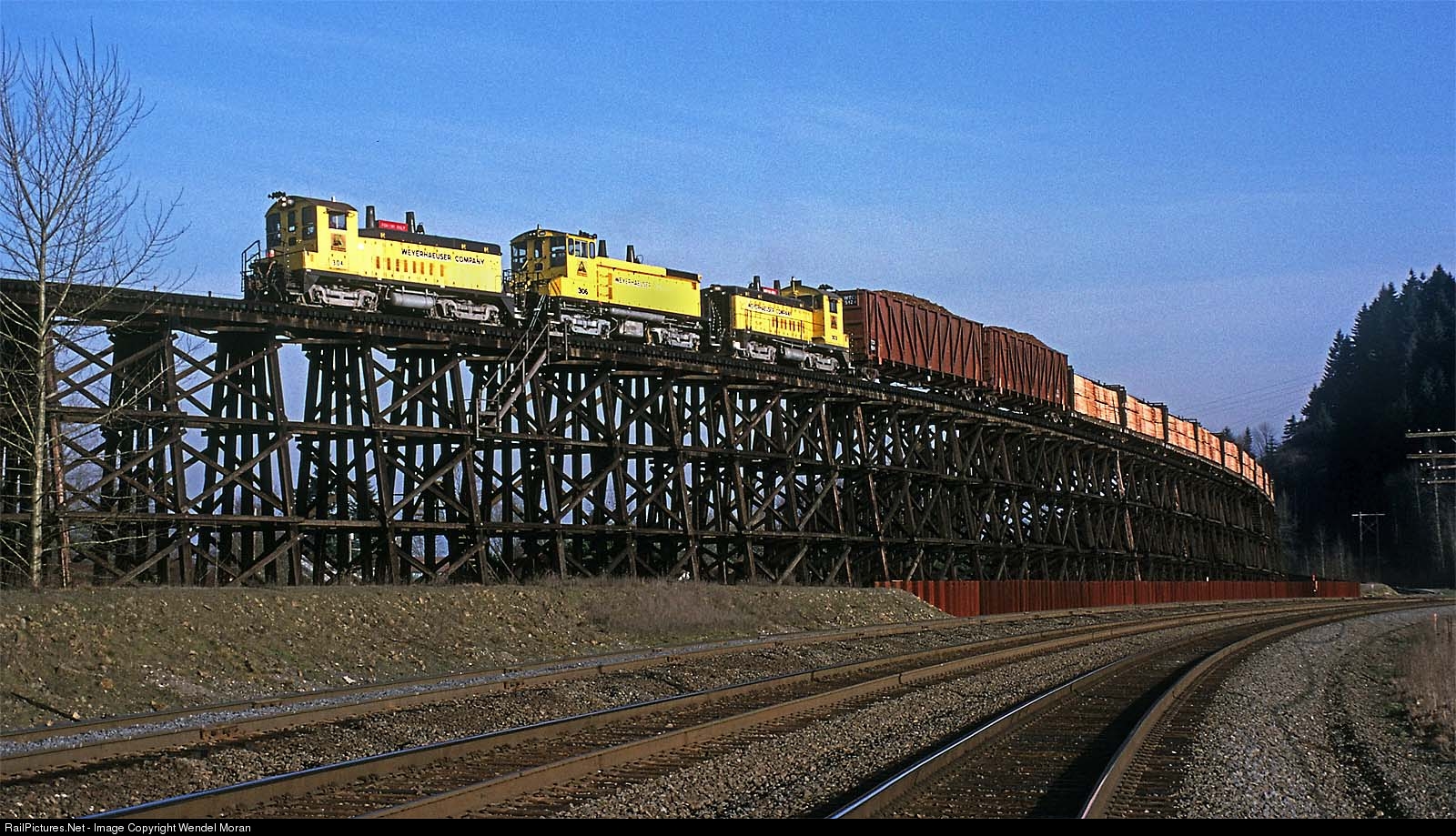 Weyerhaeuser's inbound Woods Line train to the Longview, Washington mill is crossing the spectacular trestle at Rocky Point. The tracks in the foreground are Burlington Northern's main line between Seattle and Portland.