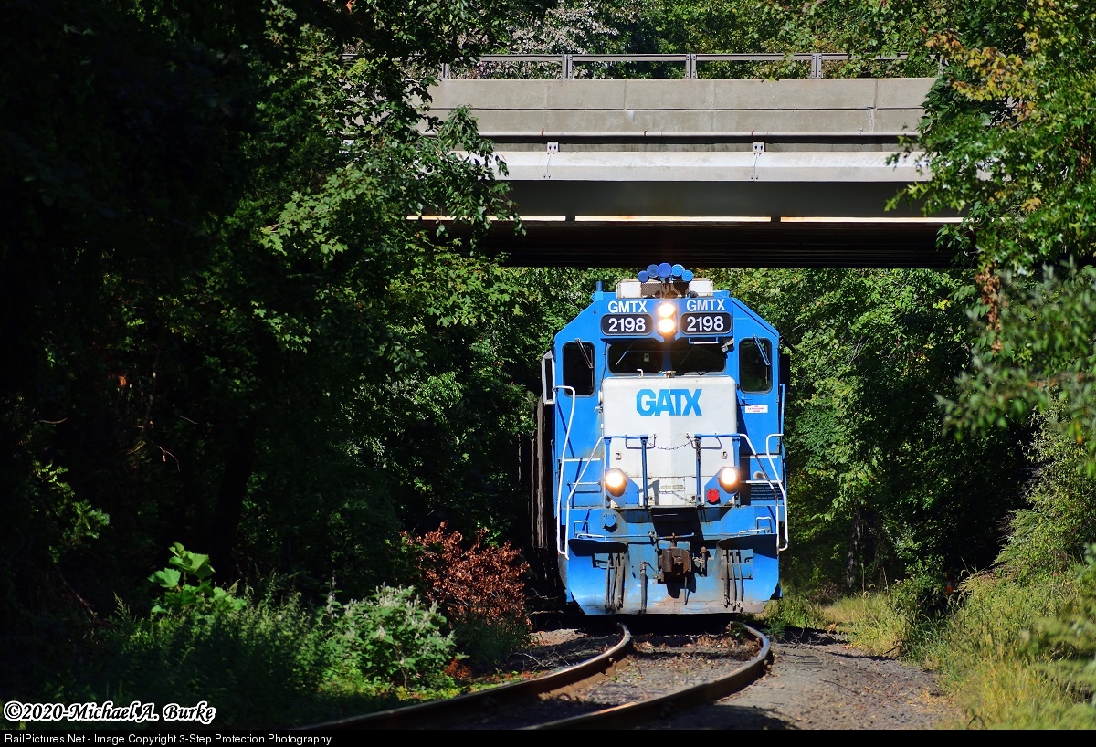 | On lease to the Branford Steam Railroad is GMTX GP38-2 2198, which is passing under I-95 in its namesake town, with crushed stone loads from Tilcon's North Branford quarry. The train is headed for Pine Orchard Yard, where the locomotive will run around its train and shove the hoppers up to Juniper Point on Long Island Sound for unloading into barges. |