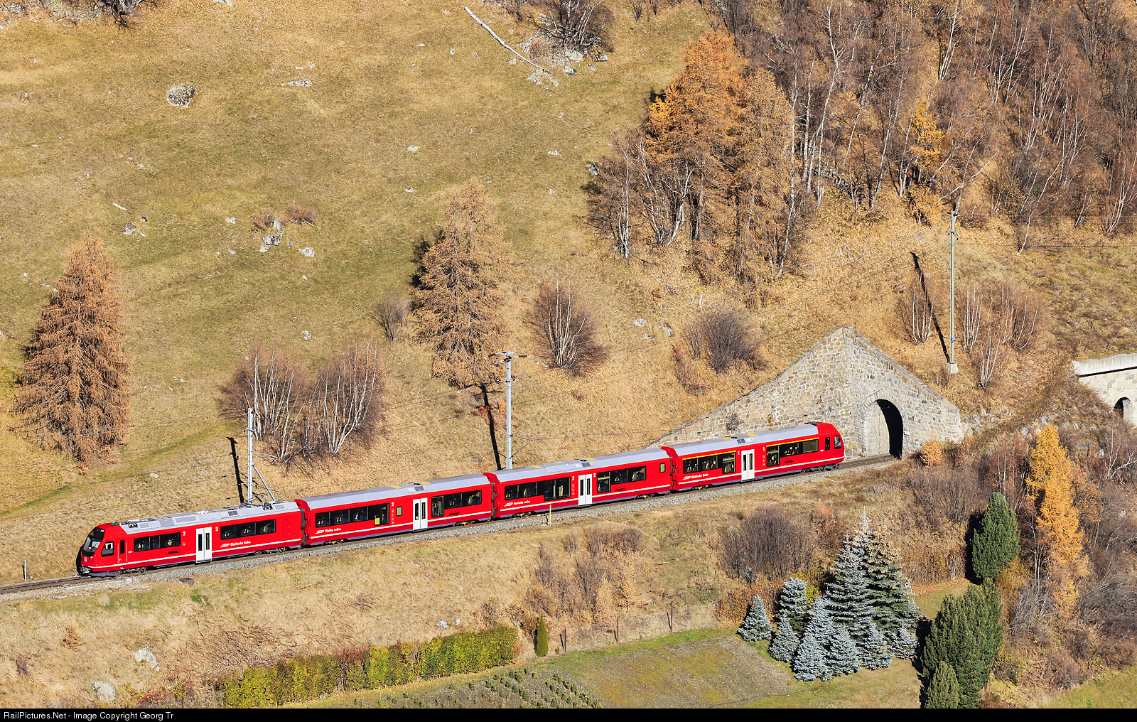 New "Capricorn" trainset (RTZ = Regional Trieb Zug) ABe 4/16 # 3113 of the Rhaetian Railway is on a driver training run through the Engadine, from Samedan to Scuol-Tarasp and back. The train left Susch shortly and is entering the 128 meter long Valauta tunnel. The RhB ordered 56 of this new train with automatic couplers, 1600 kW and 120 km/h maximum velocity from StadlerRail, more then 10 are delivered and some are in timetabled passenger service already. The train has 35 first class and 137 second class seats and space for luggage, bycicles, skis, strollers and wheelchairs. Regular service will start with the line from Landquart via Küblis to Klosters, where the train will be split into a part for Davos and another part via Vereina-Zernez to St.Moritz. Between Landquart and Klosters and vice versa, up to 4 "Capricorn" trainsets will be coupled together to form a more then 300 meter long train.