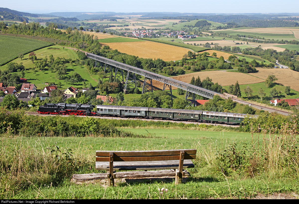 | On the Sauschwänzlebahn 50 2988 is en route with the morning train from Zollhaus-Blumberg to Weizen. The viaduct of Epfenhofen has a length of 264m / 288yds; the maximal height is 34m / 37yds. |