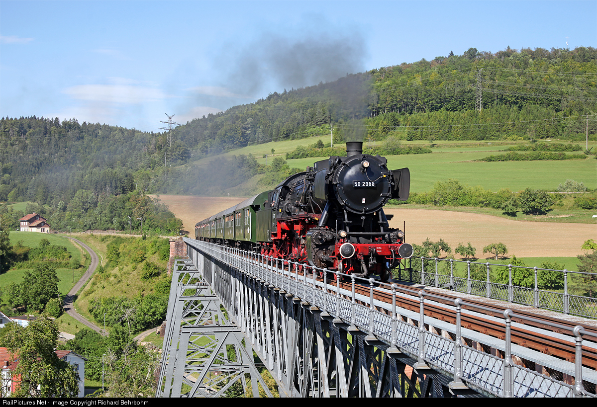 | After the derailment of steam locomotive BB 262, 50 2988 was in operation some days on the Sauschwänzlebahn. The train is crossing the viaduct of Epfenhofen.