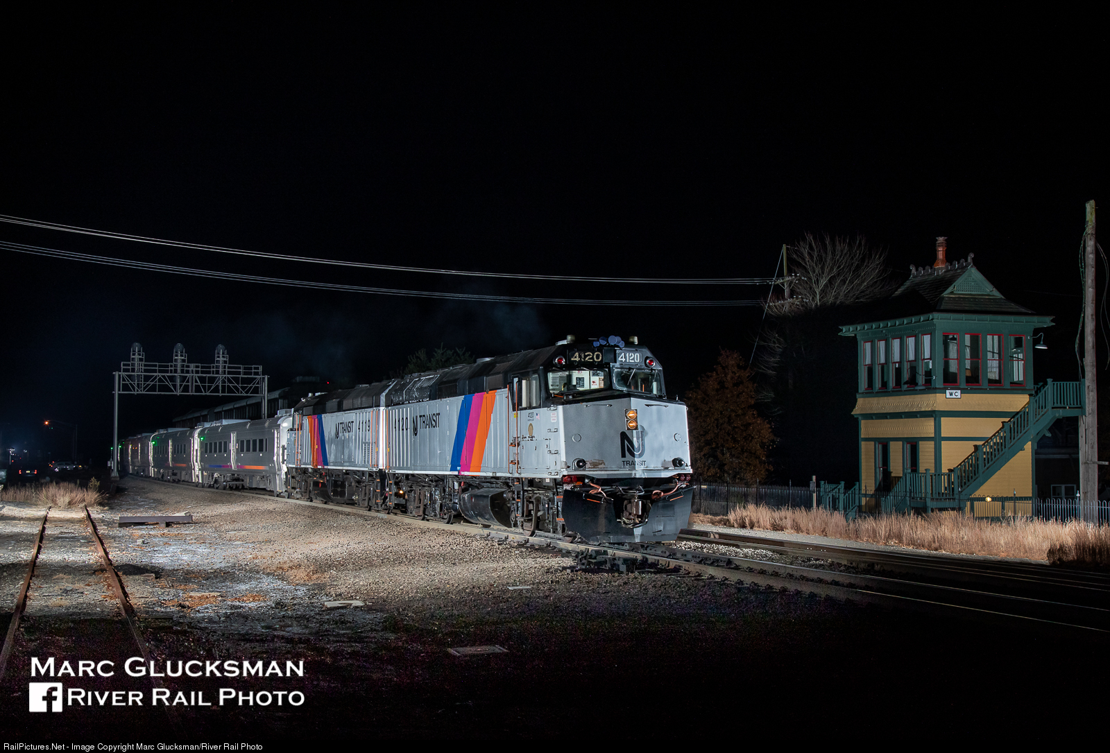 The "Boxes" Are Back, Again. New Jersey Transit Train 1171 had a classy couple of cowls leading to Suffern, New York on Monday, November 9, 2020. NJTR 4120 and 4119 (EMD F40PH-2CAT) have been paired up for a few recent assignments on work trains, but are making the (re)return to passenger service on an unseasonably warm autumn evening as they pass the former WC Tower (now Waldwick Historical Society Erie Signal Tower Museum) in Waldwick, New Jersey.