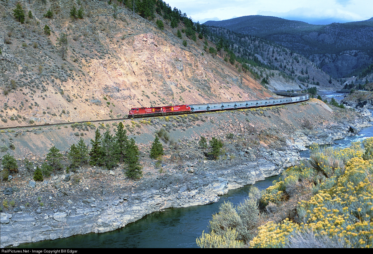 | A CP potash train rolls west along the Thompson River on CN trackage east of Lytton, BC. Directional running is in place and CP/CN use the CN westbound and CP trackage eastbound. |