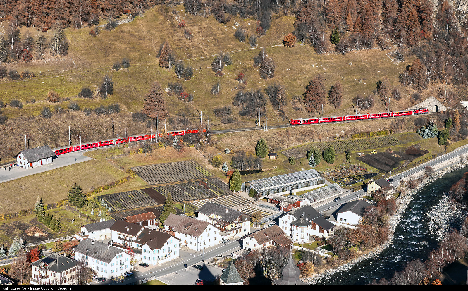 Every hour, the regional trains of the Engadine line are crossing in the station of Susch. Ge 4/4 II # 621 is standing in the station with the push-pull train 1928 from Pontresina to Scuol-Tarasp, while train 1925 from Scuol-Tarasp to Pontresina is entering the station, with locomotive Ge 4/4 II # 625 shoving in the rear.
