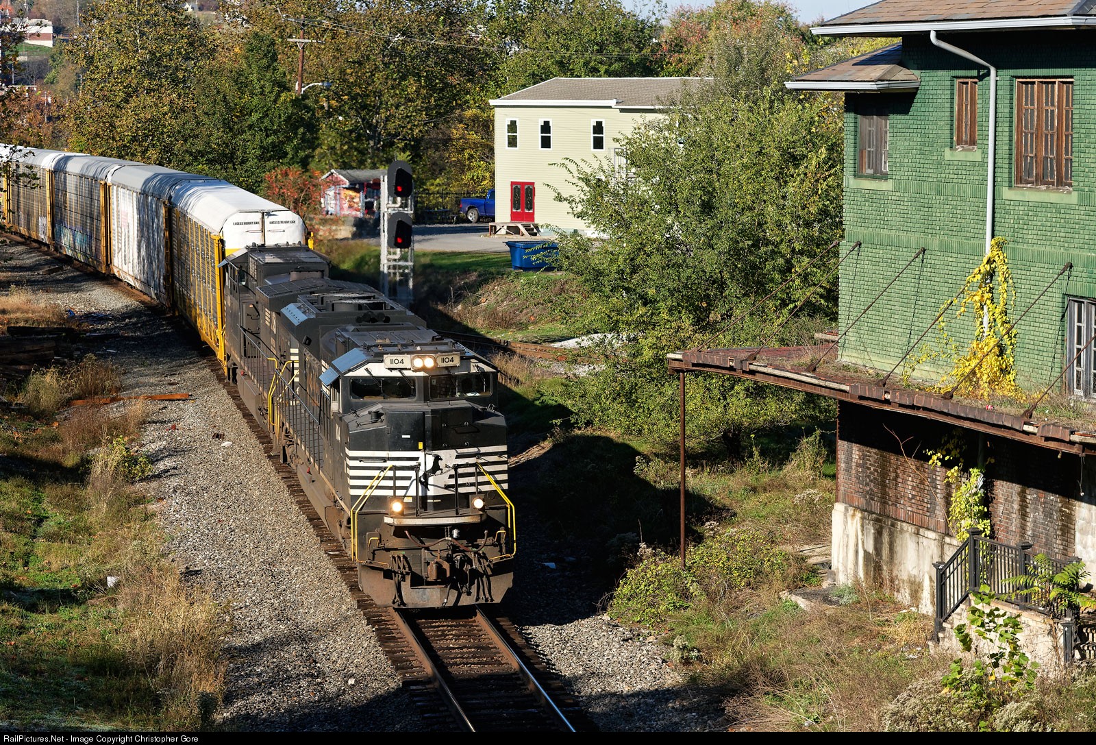 NS 1104 leads autoracks past the CNJ station in Phillipsburg.