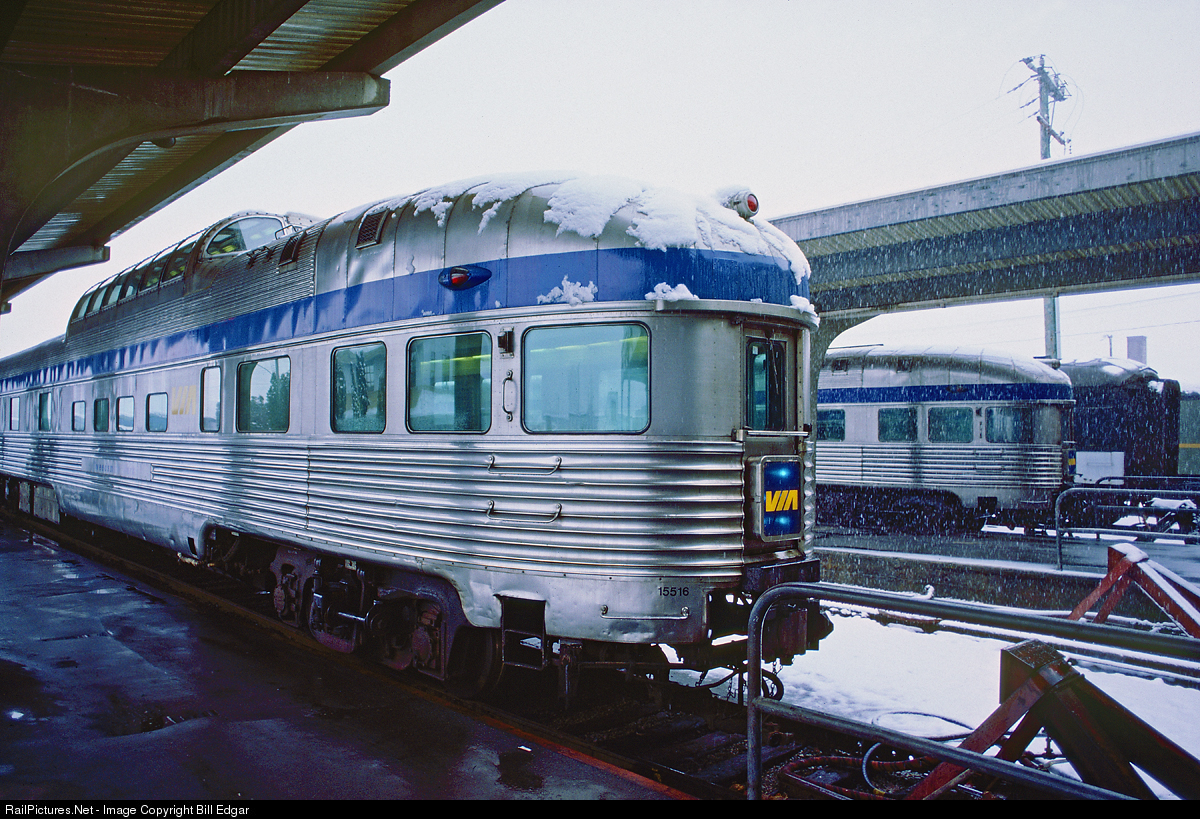 VIA's Canadian is ready to load passengers at Vancouver, BC during a blizzard that will shut down the airport and close Hwy 1 in the Fraser Canyon. The train will run, leaving Vancouver on time. The Tweedsmuir Park brings up the rear, while another Park observation looks on a couple tracks over.
