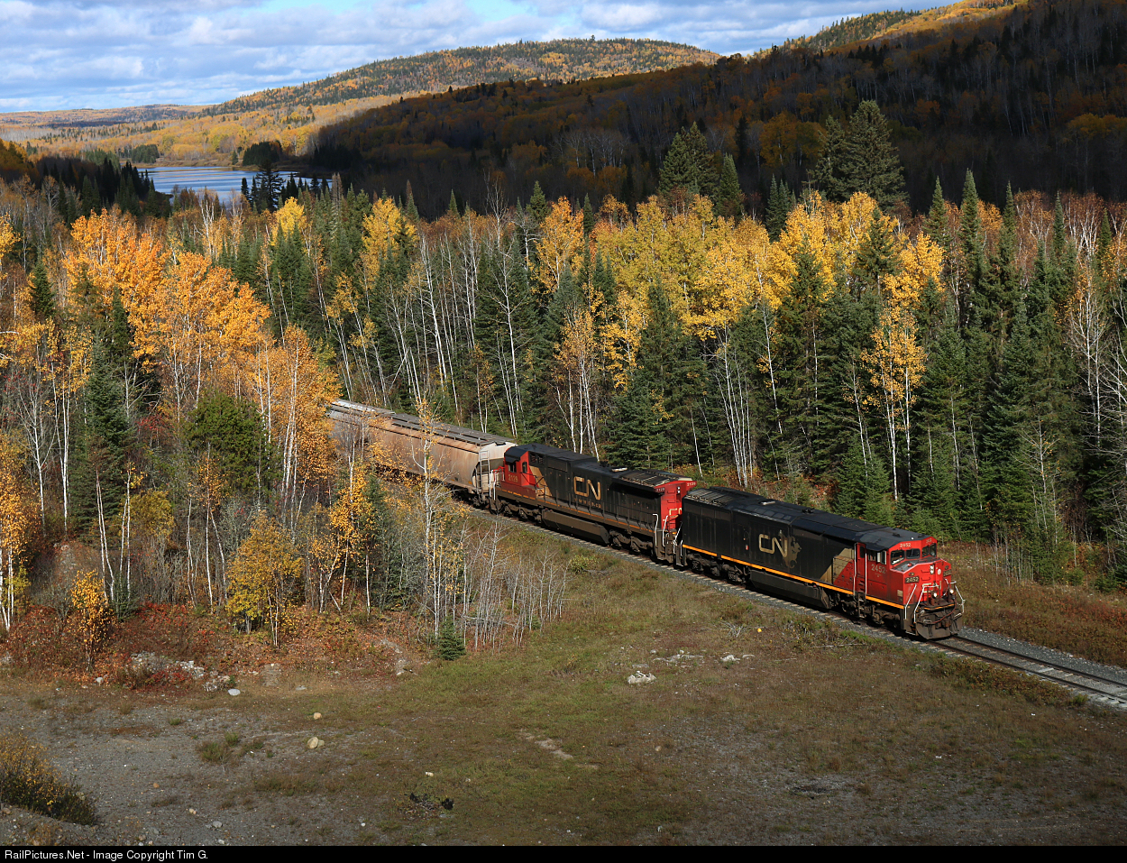 Cloud cover breaks just in time to light up the beautiful fall colours lining the walls of the Kaministiquia River valley. A nice set of power breaks the silence leading an afternoon X436 toward Thunder Bay.