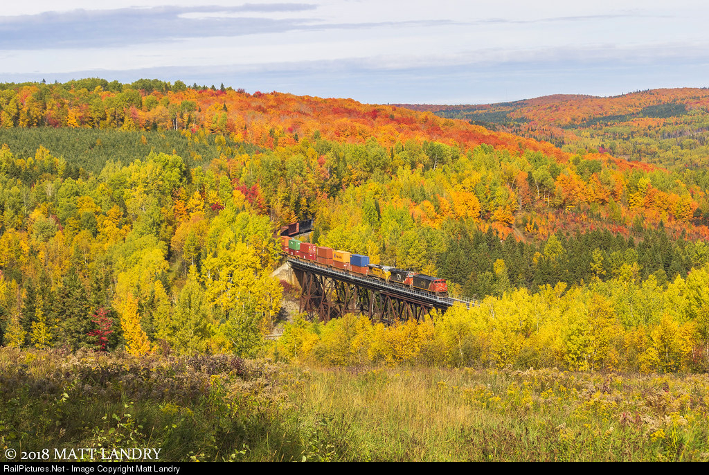 CN cowl 2454 leads train 306 across the trestle at Saint Eleuthere, Quebec with Fall colors in bloom.