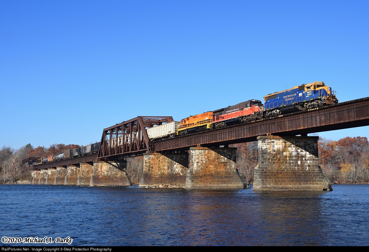 One of my favorite locations for photography on Amtrak’s Springfield Line north of Hartford is the Connecticut River Bridge between Windsor Locks and Enfield. Since Genesee & Wyoming took ownership of the New England Central and Providence & Worcester, there are still a few remaining locomotives in their original paint, and I've always hoped to shoot them on a train together. On an unseasonably warm November 10, 2020 morning along the banks of its namesake river, NECR GP38 3855, P&W Super 7 B23-7R 2215, and CSOR GP38-2 2011 lead Connecticut Southern train CSO-4 with tonnage for CSX in West Springfield, MA.