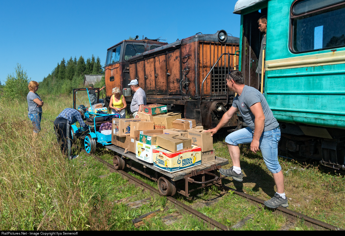 | The action take place on the Lipakovo narrow-gauge railway. On the old railroad in the Arkhangelsk region in taiga forests there are two dilapidated settlements: Luzhma and Seza. Communication with the "big earth" is carried out with the help of a passenger train, which runs several times a week by rail. It carries passengers and products of the first need. On the photo the train stopped at Seza station. Groceries and goods are loaded onto a makeshift cart, which will take the groceries along a separate path to a local grocery store. |