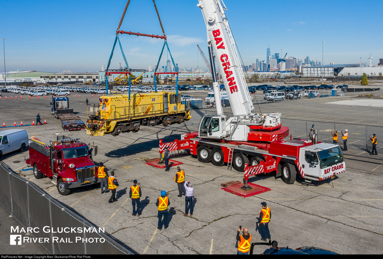 Remember This View, You Will Not See It For A While. MTA NYC Transit Subway E01 (R-77E, General Electric, 1983) is momentarily suspended off the ground while a truck backs in underneath on Thursday, November 5, 2020 at the South Brooklyn Railway Yard in Brooklyn, New York. The engine will make the trip to CAD Railway Industries in Montreal, Quebec along with E02 on a pair of trucks that night. All 10 R-77Es are being rebuilt, from their present electric only (third rail) configuration to diesels.