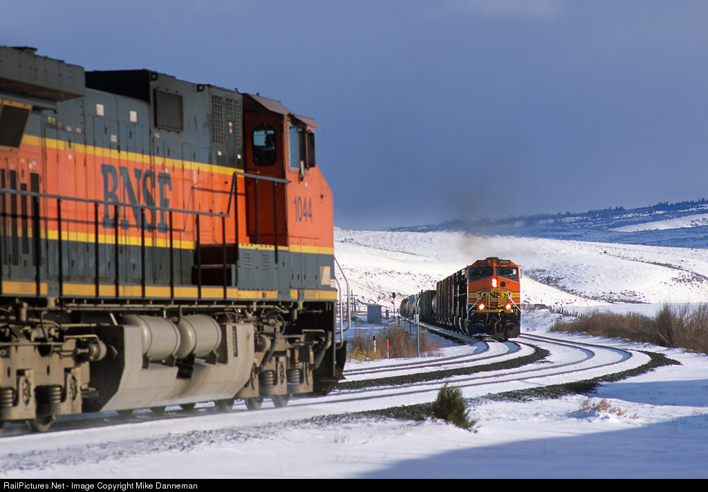 On the Provo Subdivision main line between Soldier Summit and Colton, Utah, two Burlington Northern Santa Fe freights meet at track speed on a cold February 5, 2004.
