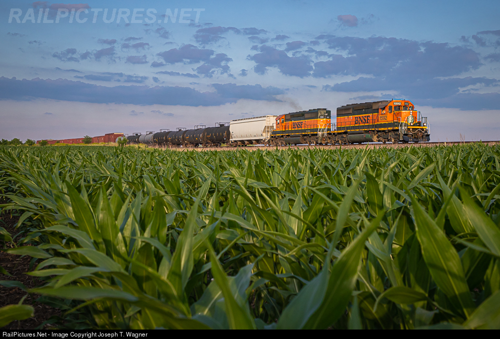 | The quaintness of a late summer's eve is temporarily interrupted by the unmistakable roar of EMD 645s as two six-axle BNSF deuces wearing paint from the company's original public image climb up a short grade out of Princeville, IL with local freight L CHI1051 18A in tow. Maturing stalks of corn crops look on at the 61 car train running from Chicago-Hodgkins as it motors west along the Chillicothe Subdivision and into the setting sun, sights set on its terminus at the classification yard in Galesburg. Following several runs unmolested by other locomotives, this was the pair's final trip together before the two were later separated at the diesel shops upon their arrival at Galesburg for maintenance. |