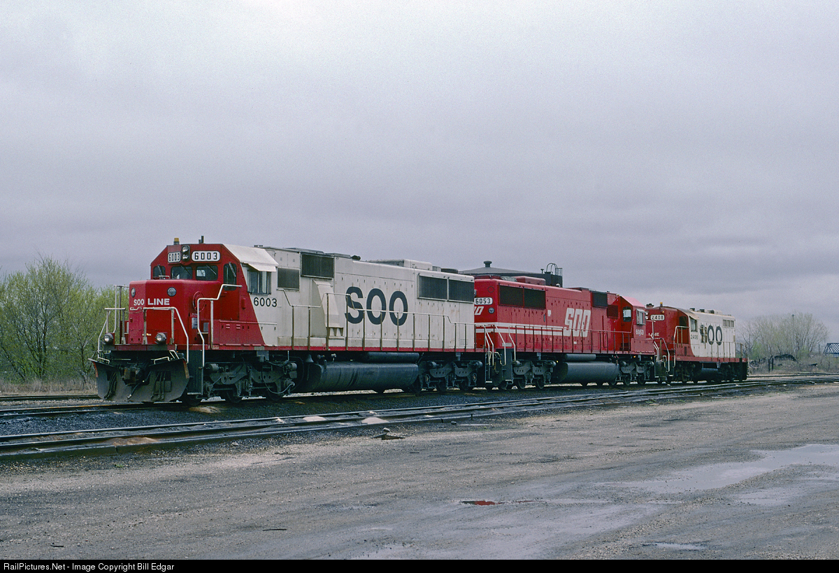| Two SOO SD60s and a GP9 mate up at Bensenville, IL at the diesel facilities on a rainy April day. The trio display three versions of SOO red and white schemes with the Geep still wearing the 1961 version. |