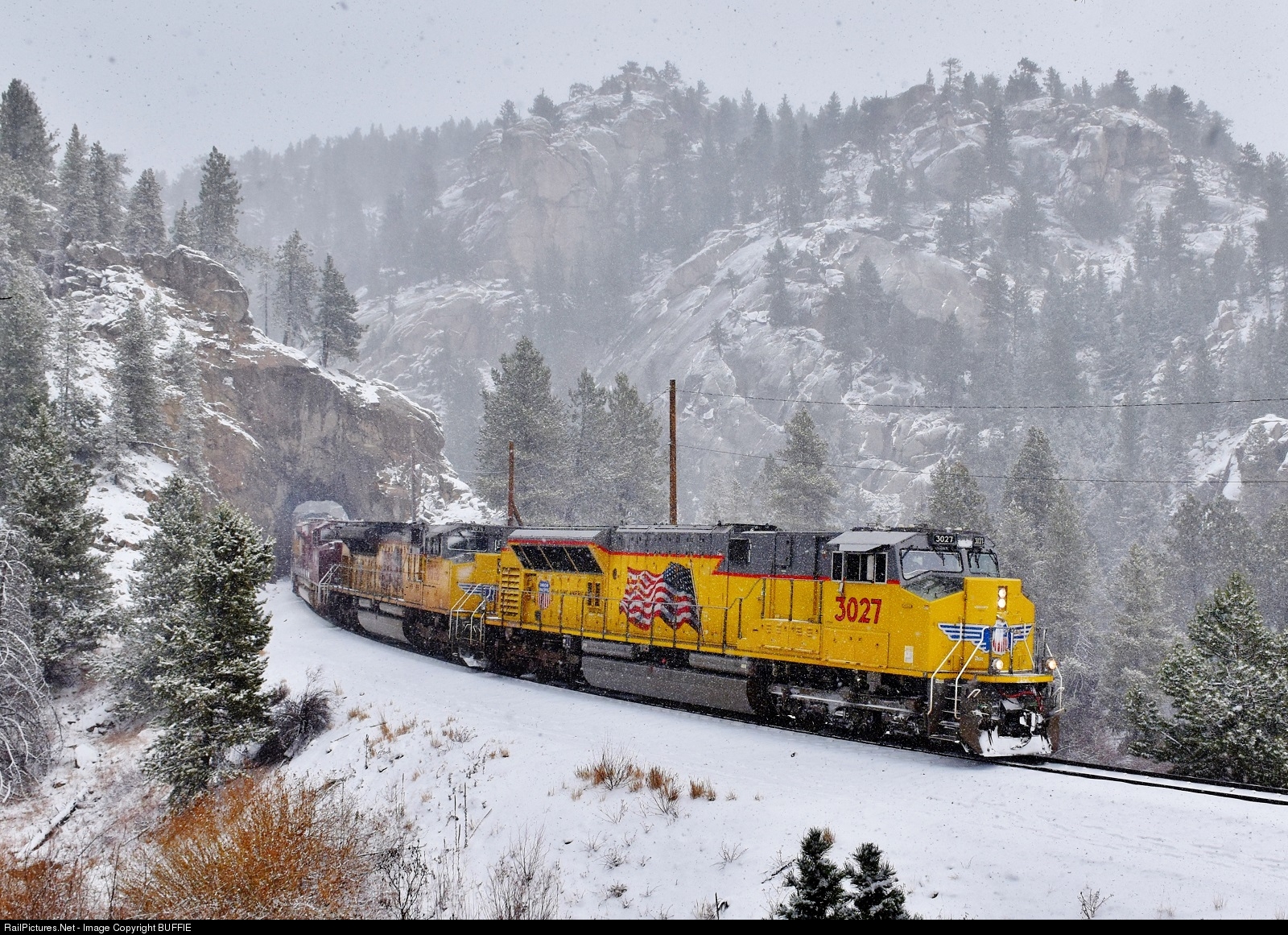 A fierce snow storm pounds the mountains around Pinecliffe, Colorado as UP 3027 (SD70AH-T4) exits Tunnel 29 and heads towards Denver.