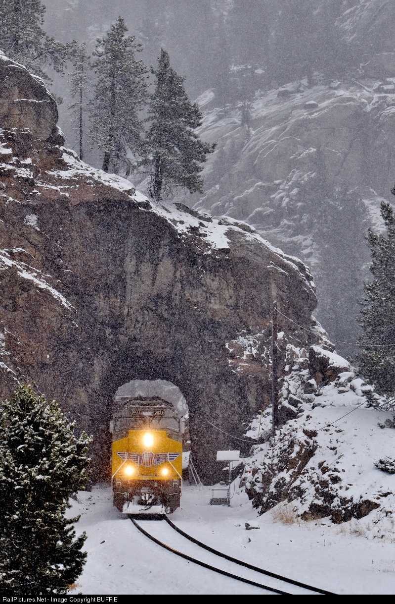 UP 3027 (SD70AH-T4) exists Tunnel 29 as it leads a freight through Pinecliffe on the Moffat Tunnel Sub. The 20 degree temperature, snow and high winds made for a cold day of rail fanning in the mountains.