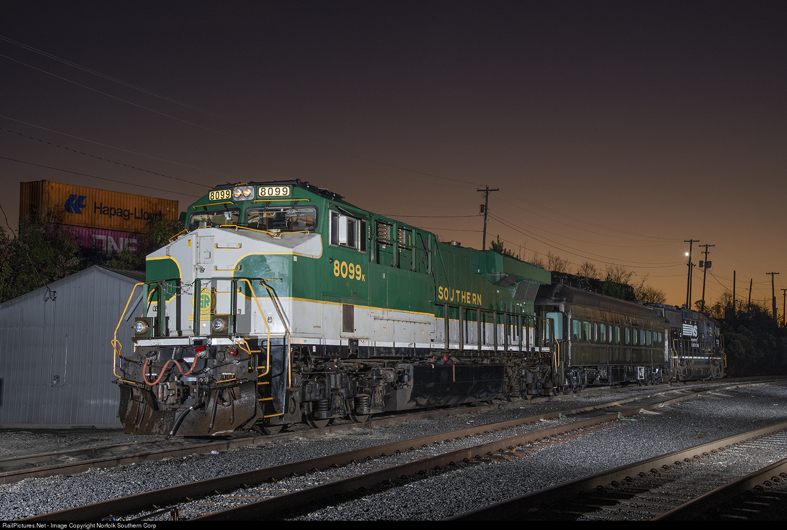 As the sun begins to brighten the horizon, train P57 prepares to depart Inman Yard in Atlanta, with GP60 #7139 leading the Marco Polo Pullman car and the Southern heritage unit, bound for a day of festivities at the Southeastern Railway Museum in Duluth, which will be the new home for the Marco Polo. Photo by Casey Thomason. For more information about Norfolk Southern, visit www.nscorp.com