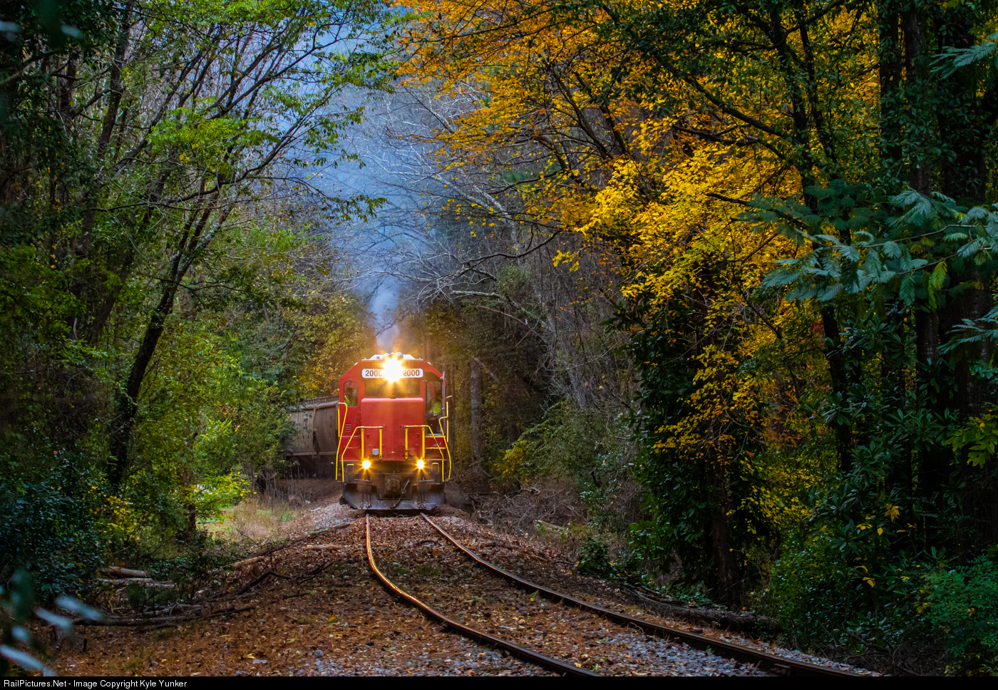 | Engineer Anthony grabs a couple notches aboard Georgia Northeastern GP38-2 #2000 as they bring an empty grain train south passing through some nice fall colors nearing Marietta,GA. |