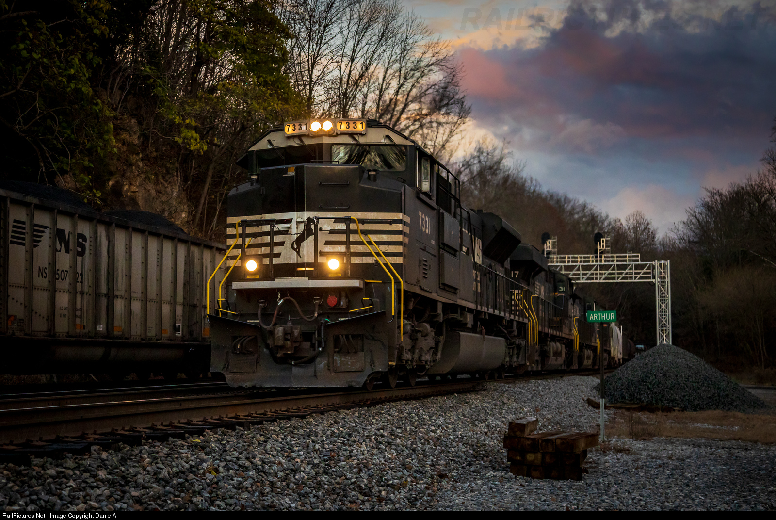 The sun has gone down over the mountain for the day, leaving a colorful sky behind for NS 15T as it thunders through CP Arthur in Shawsville, Va.