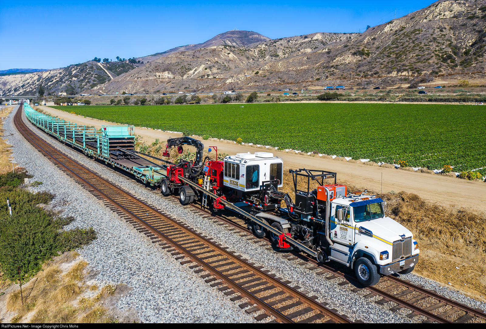 | Herzog RUM, Rail Unloading Machine, on the rear of a Union Pacific Rail Train with No. 8458 leading. The machine is able to run on the rails or on the road to a job site. The Herzog designed Machine is able to make unloading of rail faster, safer and more economical with less personnel. |