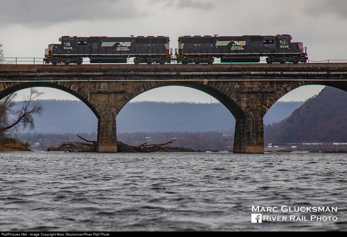 Hunting Altoona Fish In The Wild On A Grey Day. Norfolk Southern Corp SD40Es 6348 (née-CR 6724, SD50, 12/1983) and 6349 (née-CR 6702, SD50, 11/1983) have spent a significant portion of their recent careers within 50 miles of Altoona, Pennsylvania, serving as helper units from the east slope around Horsehoe Curve and down the west slope (or vice versa). With the introduction of the SD70ACu fleet to this pool, these SD40Es have been assigned to local service out of Enola, Pennsylvania, and are seen on NS H38 crossing the Rockville Bridge over the Susquehanna River in Marysville, Pennsylvania on Tuesday, November 17, 2020 from the Bridgeview Bed & Breakfast.