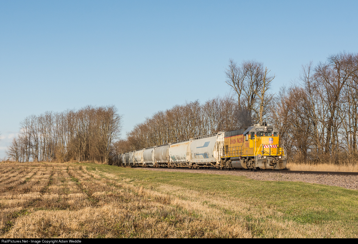 | After waiting for one Eastbound train, UPY 700 has just crossed the BNSF Aurora Sub, and is continuing the trek to Troy Grove. |
