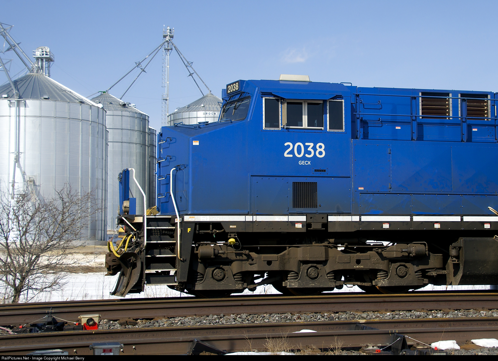 | GECX 2038 is the leader on a CN 377 which at the time was parked for a few weeks due to a protest on CN's main line along Tyendinaga Mohawk territory at the time. Most of these GECX units on CN have been repainted into CN colours and received a CN number. From what I can tell, even at this present date, 2038 had so far avoided that fate. |