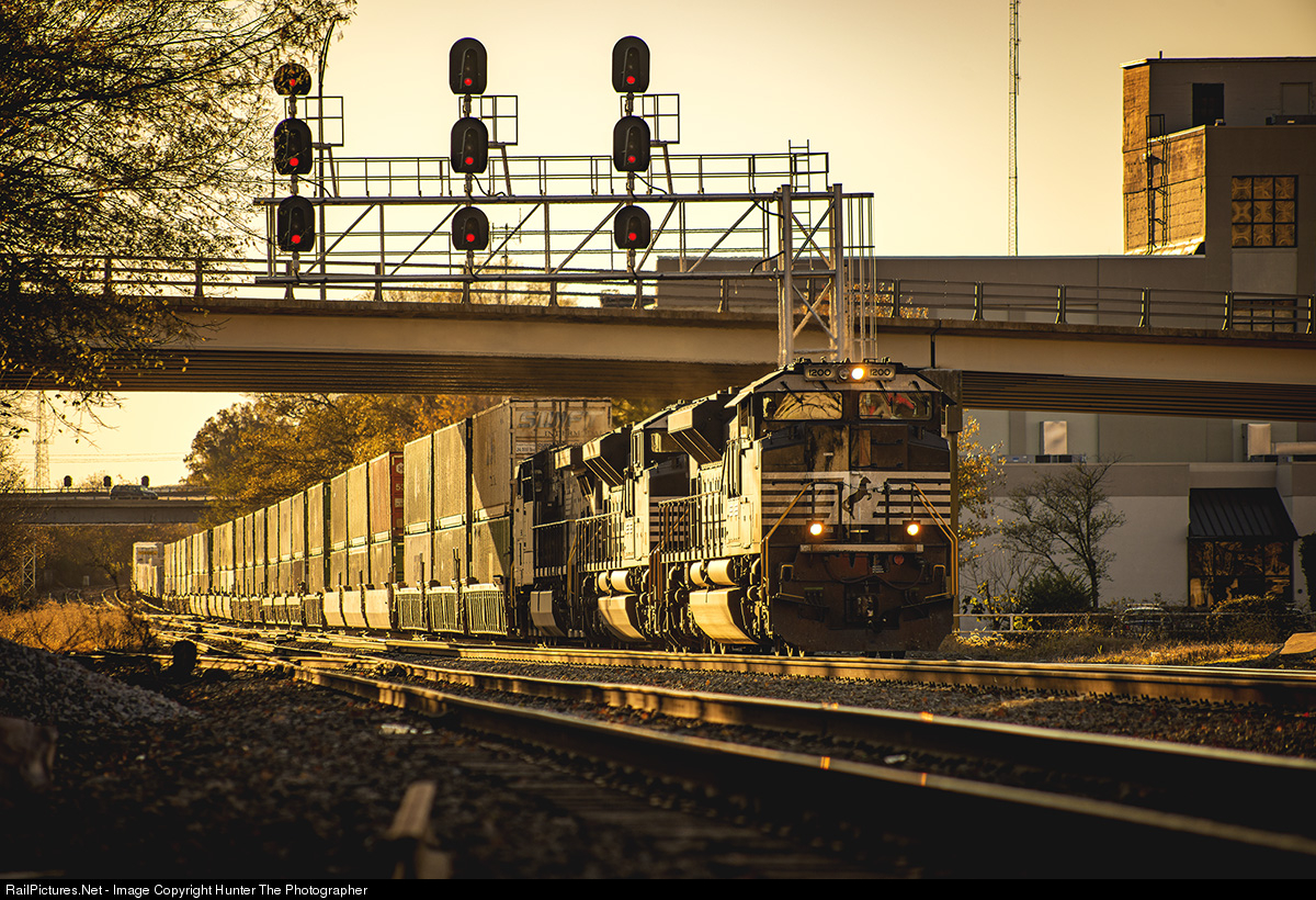 | As golden hour sets in, intermodal train 204 heads north through the signals at Elm in Greensboro, NC on November 18, 2020. |