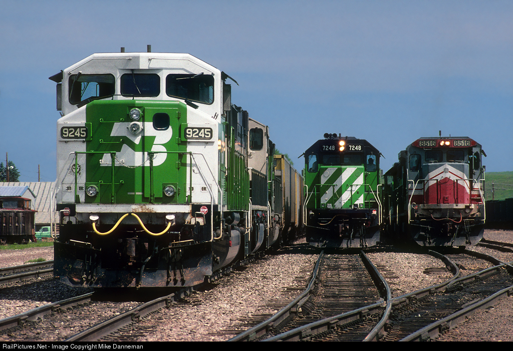 Three Burlington Northern Santa Fe trains wait to depart the yard at Sheridan, Wyoming, on June 14, 1997. The coal train led by BN EMD SD60M No. 9245 has yet to get a fresh crew, but the other two are ready to go. The intermodal train on the right, with leased LMX GE B39-8 No. 8516 leading, will depart first.
