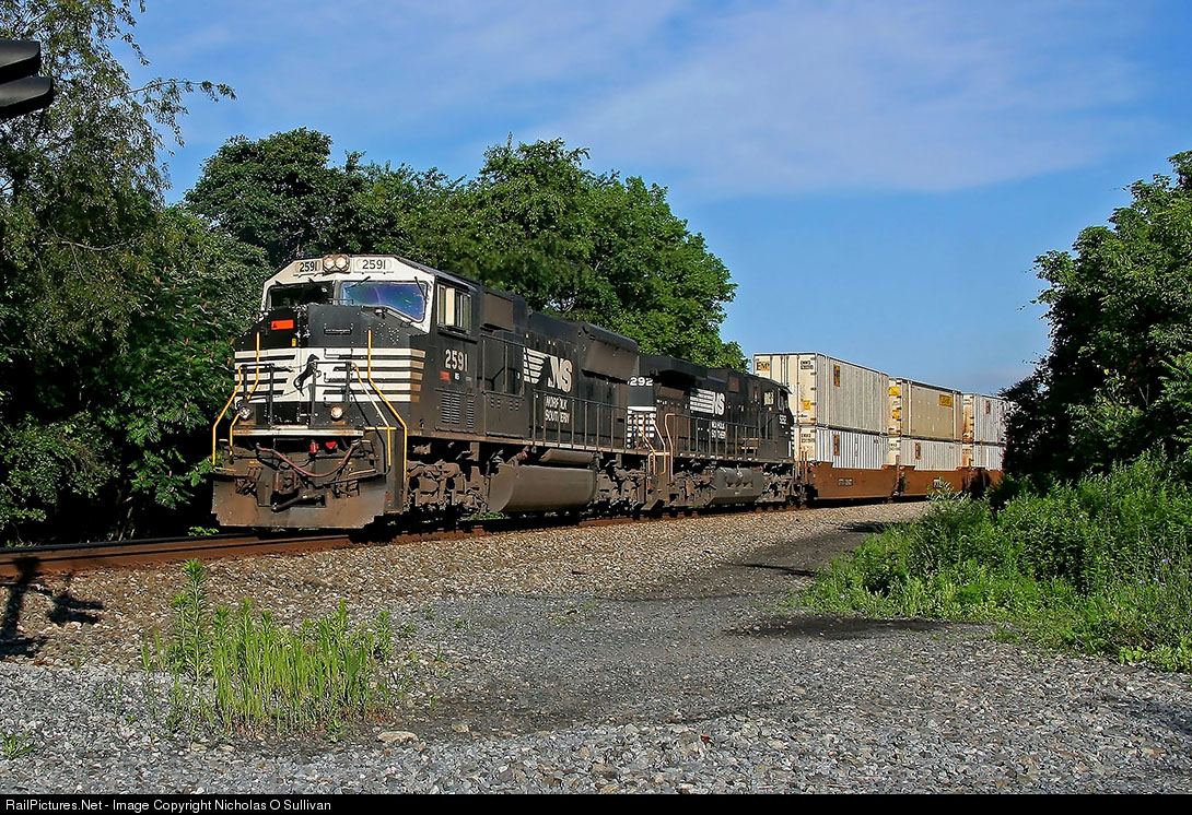 | NS 2591 (flared SD70M) and NS 9292 (C40-9W; rebuilt into AC44C6M NS 4475 in April of 2021) lead an eastbound intermodal train on the Norfolk Southern Lehigh Line. At CP Bound Brook, the train would be issued a Form D to take the Port Reading Secondary for the final portion of its trip east. The leader was retired by Norfolk Southern and sold off to Progress Rail in March 2020. |