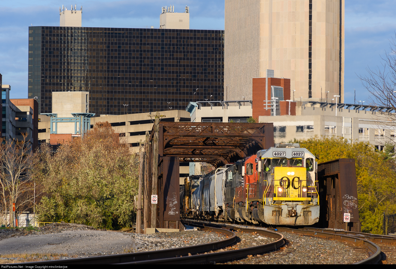 | An Ohio Central tunnel motor leads the CUOH's NKWA turn as it makes its way through downtown Columbus, Ohio and crosses the Scioto River. The train is making its way over the NS Columbus District as it heads towards Wakins Yard for interchange with Norfolk Southern. |