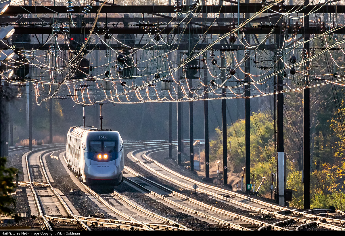 | An Amtrak Acela Express led by No. 2034, rounds the bend just shy of the station at Metuchen, NJ following a path illuminated by a late afternoon Sun. |