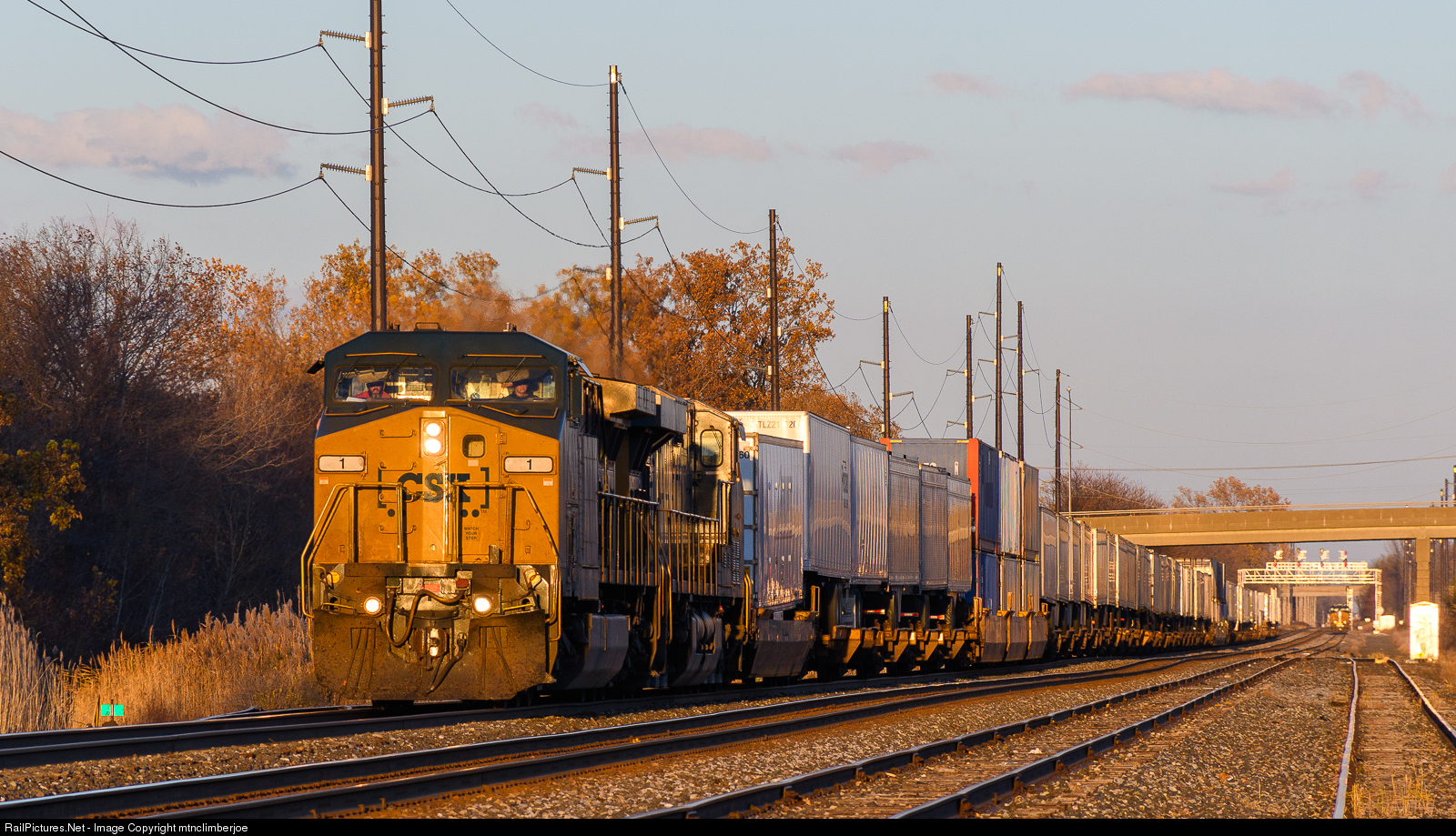 | Golden hour sun casts a warm glow over Erie, Pennsylvania as CSX 1 leads intermodal train Q001 westbound, riding on approach signals behind Q165 after the train stopped briefly in Erie. |