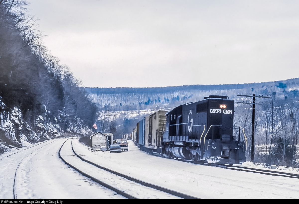 A drab locomotive did nothing to brighten the scene on a cloudy winter morning at Jefferson, Junction, Pennsylvania, or JN Cabin. The train is on the Delaware & Hudson Penn Division, and the “Jeff Connection” to Conrail’s Southern Tier line is on the left. The Jefferson Connection is a bit deceptive to the casual visitor. The connection to the Southern Tier is less than two miles away, as is the point where the Penn Division passes under the Southern Tier at the Starrucca Viaduct. It seems that the connection would drop down to the meet the Penn Division at JN, but it is relatively level. The north slope of the famed Ararat grade begins at Lanesboro, and the Penn Division rises from there to JN. A closer look at the train indicated that it is indeed climbing.