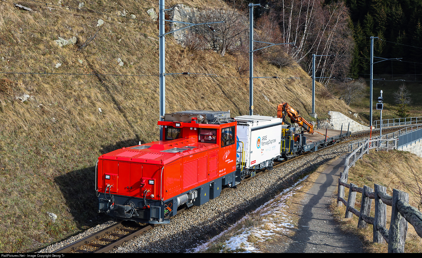 The new Stadler built cogwheel diesellocomotive HGm 2/2 # 702 of the Matterhorn-Gotthard Bahn (MGB) is pulling the track measuring car P # 10175 of the ARGE FahrwegDiagnose (Sersa, INovitas, Kistler) and the flat car with crane X 4943S (built 1957, former Furka-Oberalp-Bahn) of the MGB, which serves as brake car, especially in the cogwheel sections.