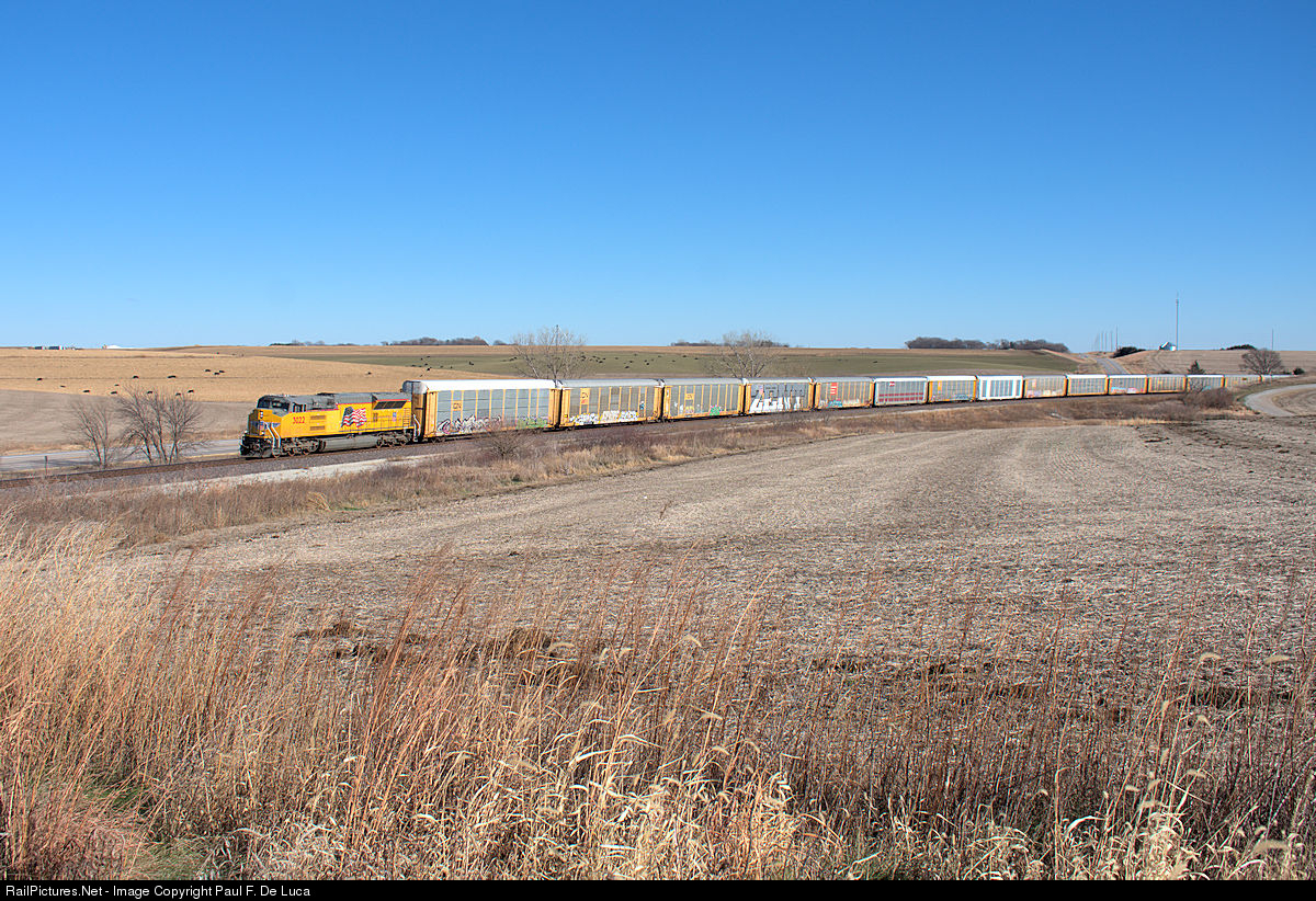 | An auto train with a fresh SD70ACe-T4 is climbing thru the rolling hills just east of Arlington, NE. US Highway 30 can be seen behind the train. |