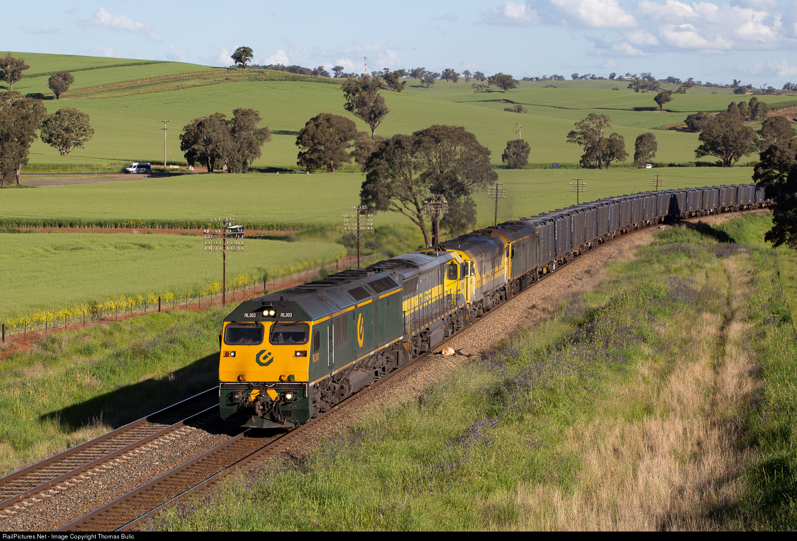 | Qube quad of RL303, 1106, 44202 and 8037 begin the climb up Morrisons Hill with 3164 from Junee Sub Terminal to Minto. |