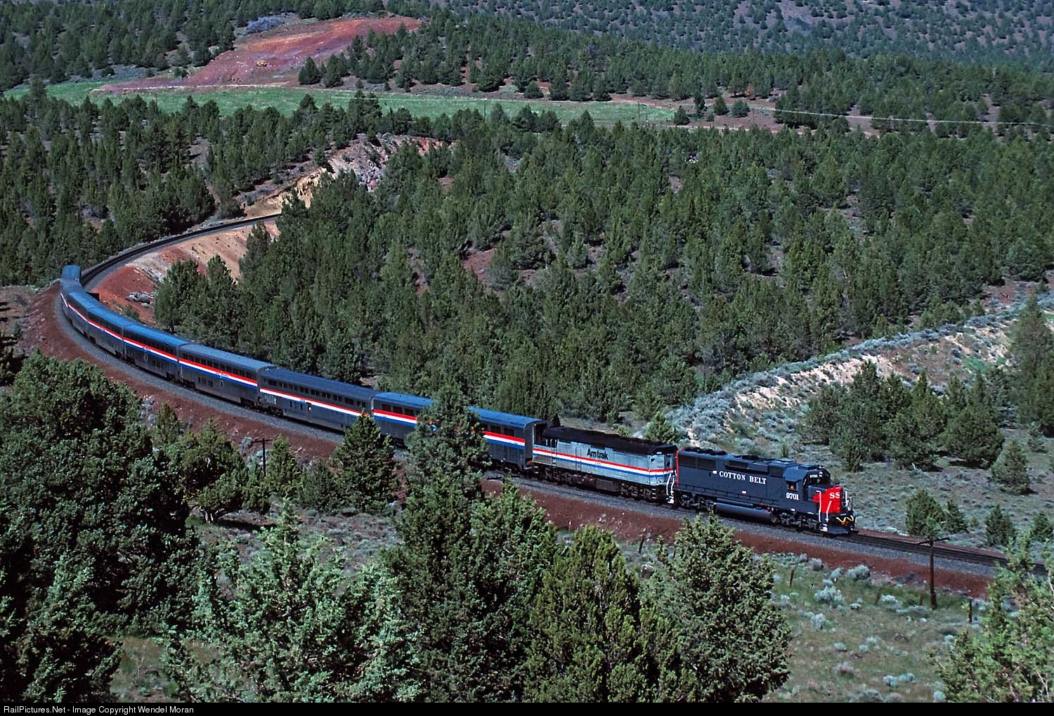 A special Amtrak train from Portland, Oregon to Redding, California has just crossed over the Oregon/California state line on the Shasta Route. The original California Northeastern grade can be seen above the locomotives.