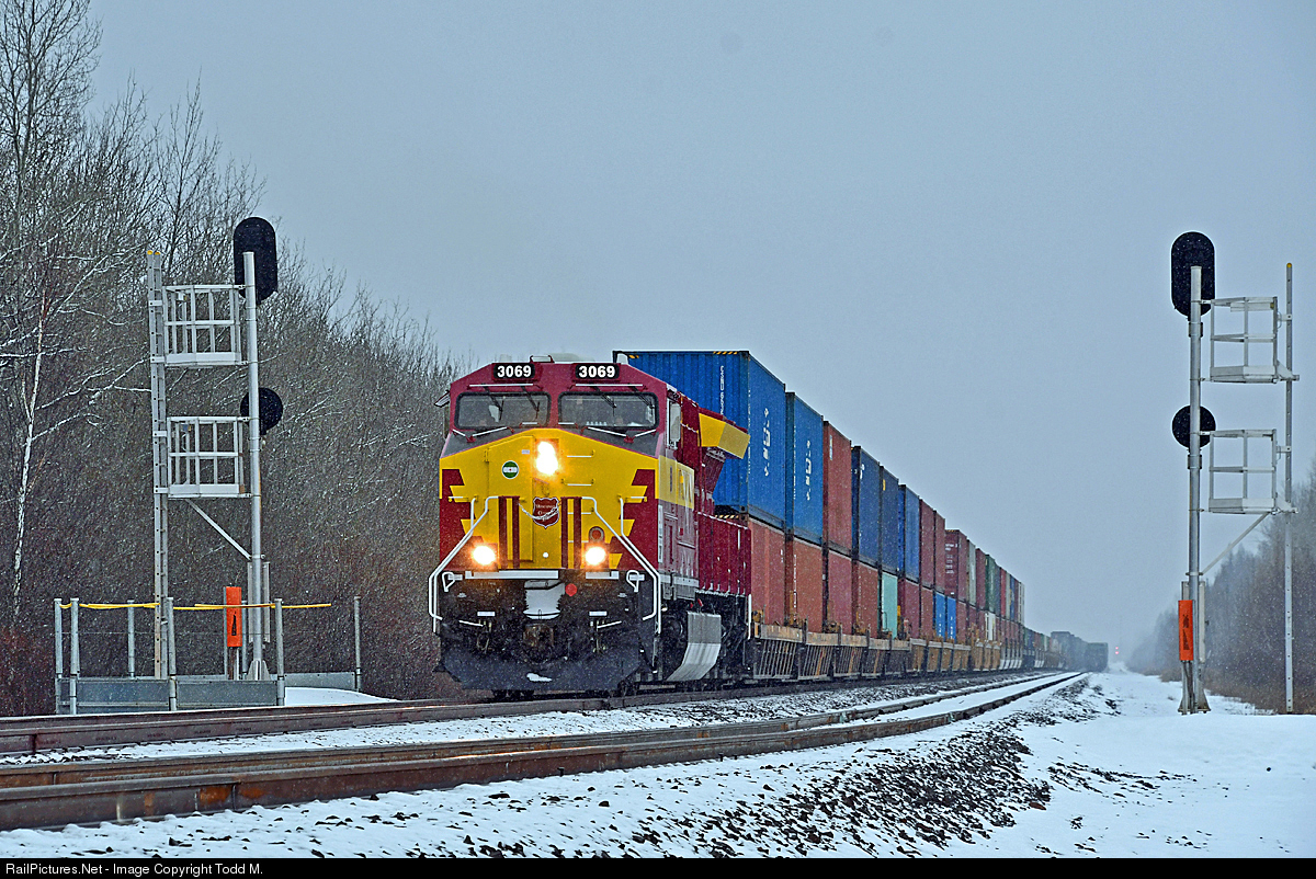 | A little snow mixed with rain is falling on a dark and gloomy Sunday afternoon with CN's privatization celebration paying homage to the Wisconsin Central, CN 3069 leading Q117 getting back underway for the Canadian border at N. Kelsey on the CN Missabe sub after meeting a southbound L568. |
