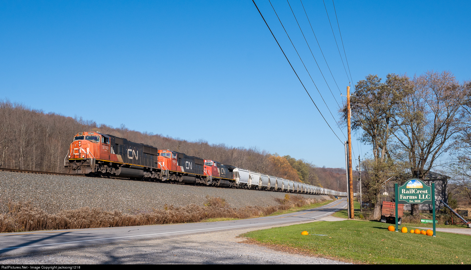 | Norfolk Southern train 68N, an as-needed Chicago, IL to Corning, NY frac sand train passes Railcrest Farms in Dale, NY with a trio of CN locomotives. |