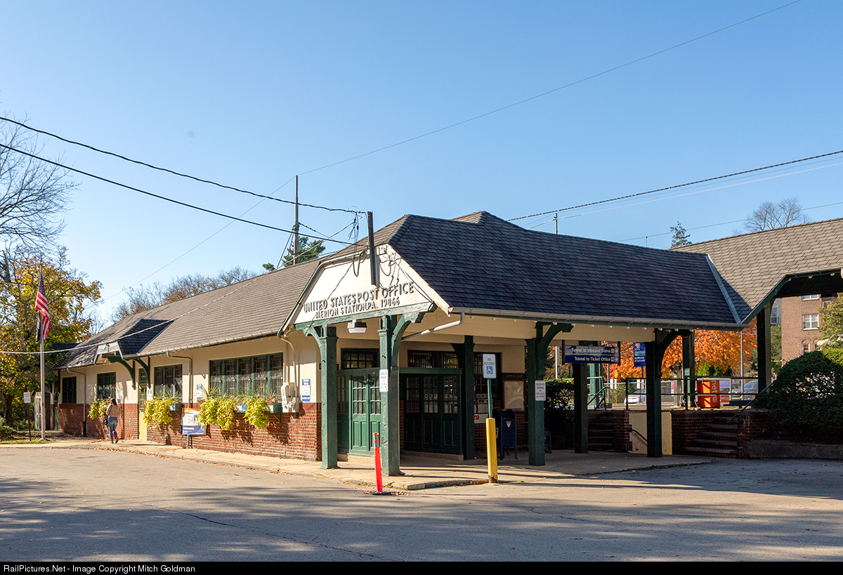 The Pennsylvania Railroad's original 1864 built outbound station in Merion, PA. This station is owned by Amtrak, served by SEPTA and leased to the United States Post Office. Merion is often referred to as "Merion Station," as seen here, as this is the place name that the United States Postal Service recommends using in order to distinguish Merion from other areas in Pennsylvania with similar names. Click here to see the "newer" 1914 built inbound station.