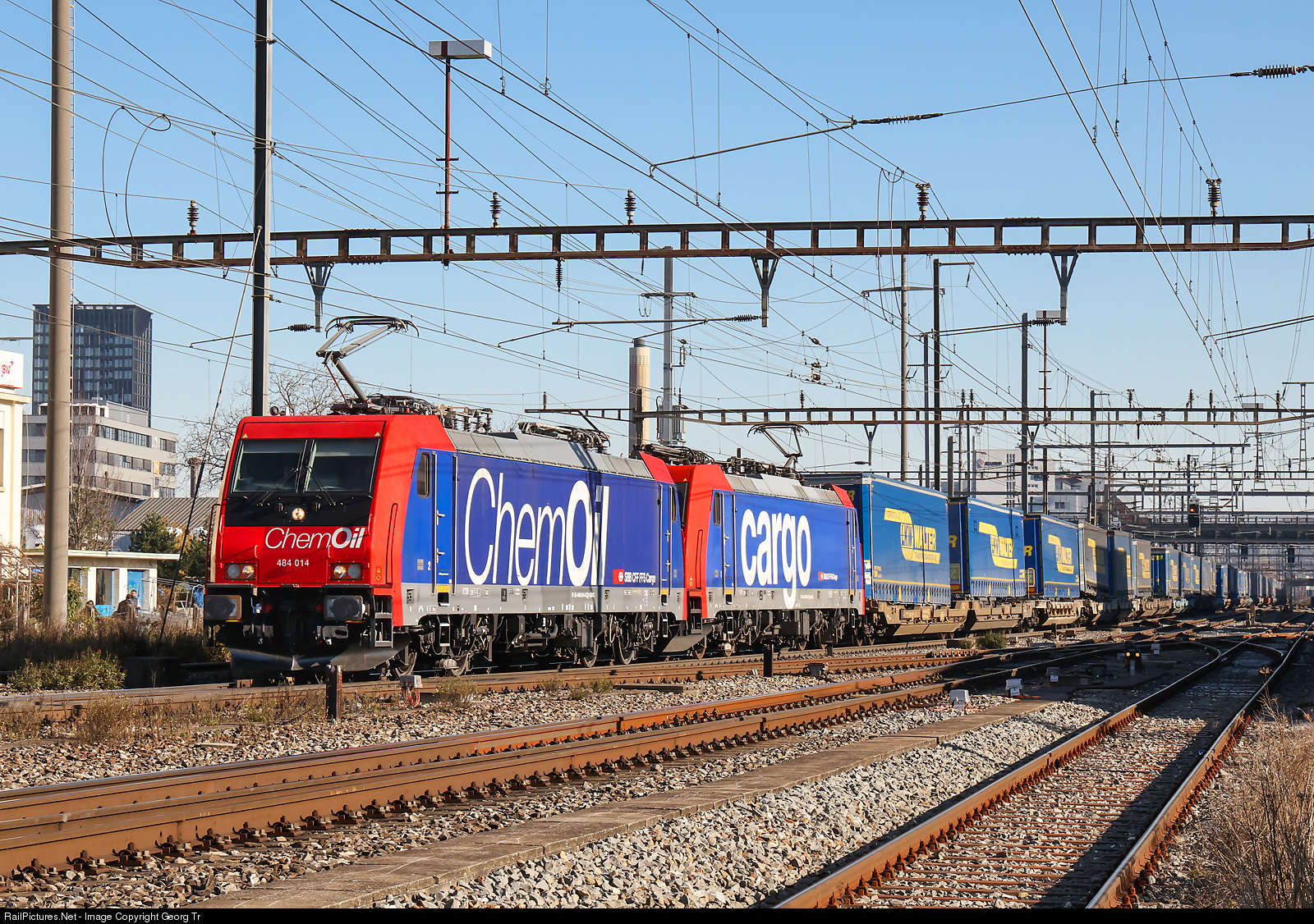 | Re 484 # 014 (in CHEMOIL publicty paint scheme) and # 006 of SBB Cargo International in multiple control are pulling the northbound "LKW-Walter" intermodal train 43716 from Novara Boschetto via Domodossola-Simplon-Lötschberg-Basel to Lübeck Skandinavien Kai through Pratteln. |