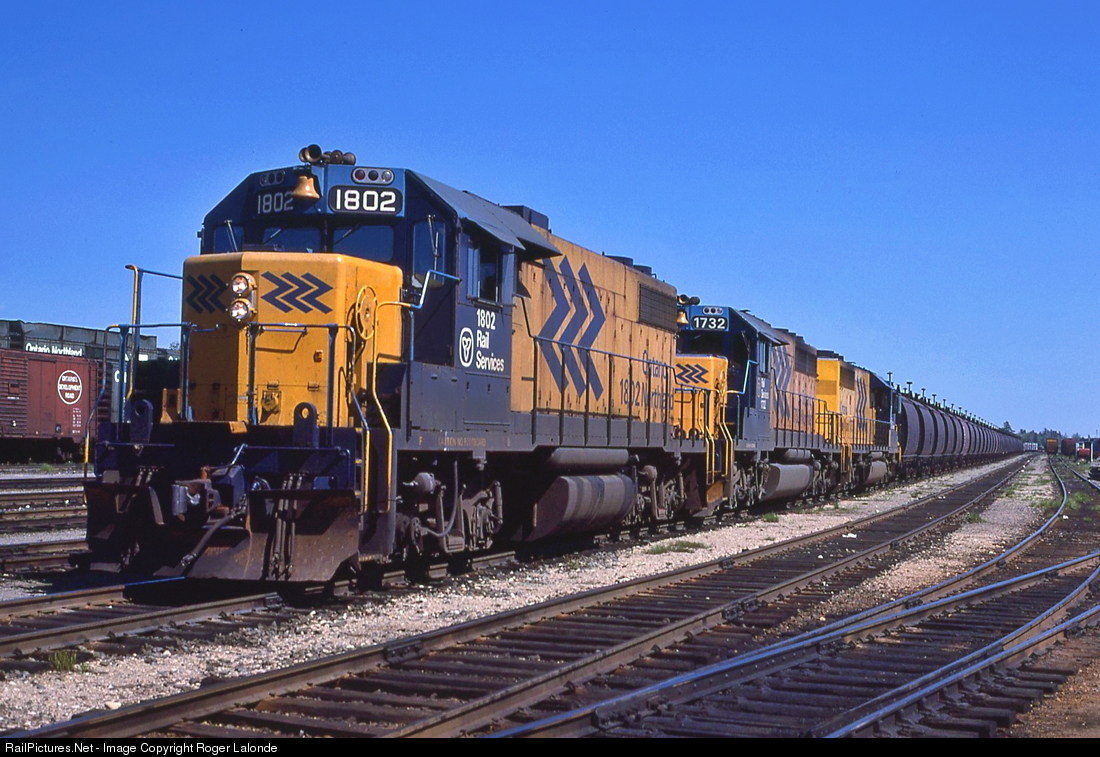 Ontario Northland Railway GP38-2 1802 and SD40-2 1732 and 1734 at North Bay, Ontario yard.