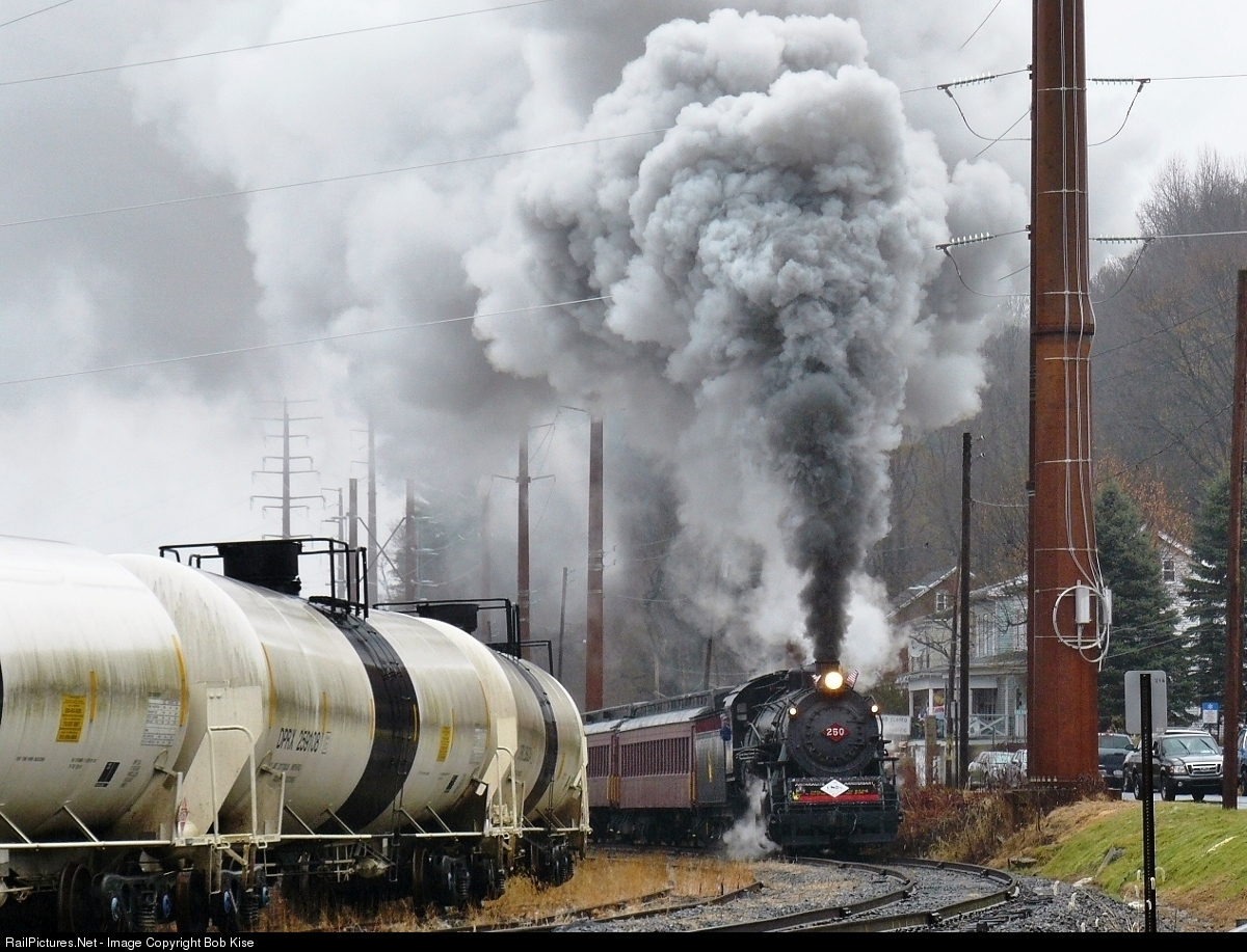 | In 40 years of chasing steam trains, this had to be one of the most impressive smoke plumes that I had ever witnessed- the CNJ 0-6-0 No. 113 in a steady drizzle, working upgrade along the West Branch of the Schuylkill River. The "250" number plate was to commemorate the 250th year of anthracite coal mining in 2018. |